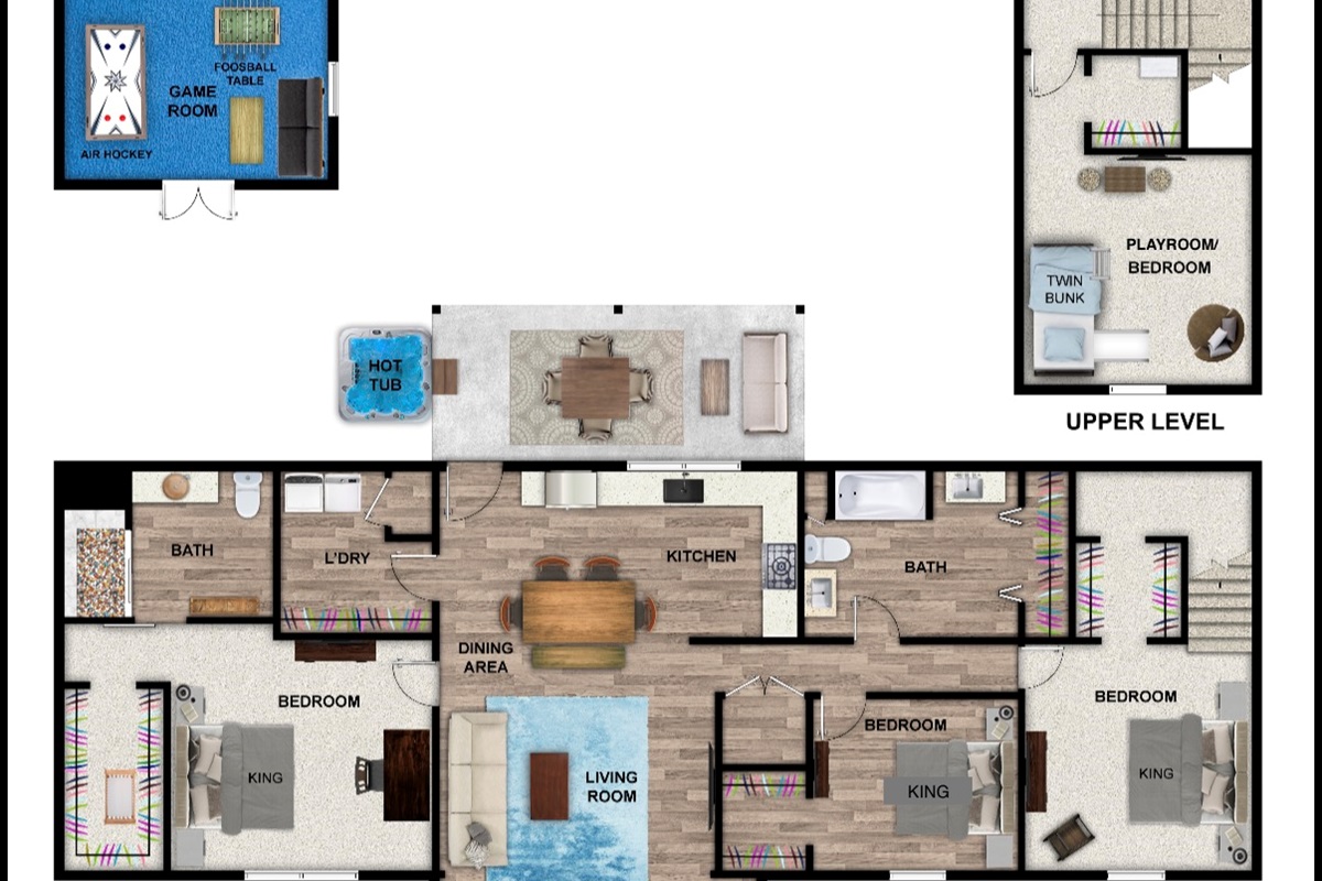 There are 2 king bedrooms, a queen bedroom and 4th bedroom with twin bunkbed. The house also includes open kitchen and living area and laundry room, outdoor game room and fire pit.